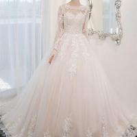 Une robe de mariée princesse au style robe de bal, avec corsage en dentelle perlée et manches élégantes.