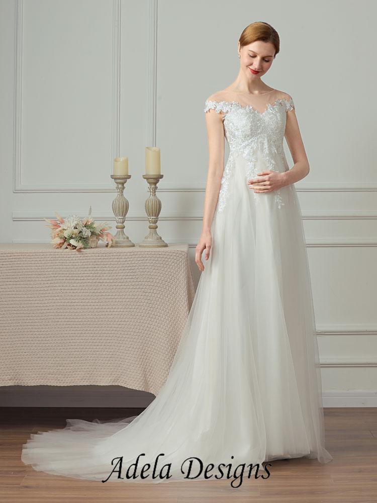 Une robe de mariée A-line en dentelle et tulle, coupe Empire idéale pour les femmes enceintes.