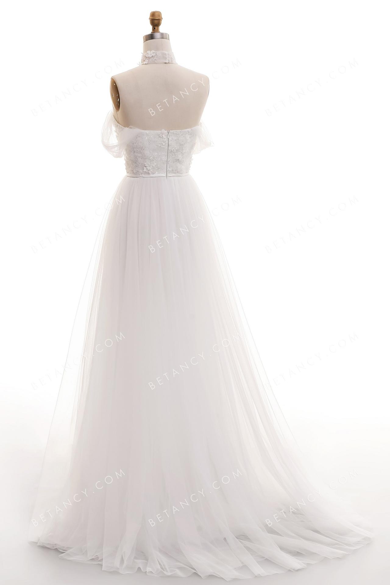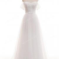 Robe de mariée A-line en dentelle & tulle – épaules dénudées, décolleté chérie & traîne courte