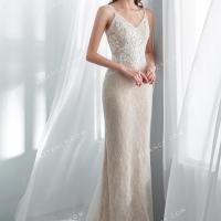 Robe de mariée champagne silhouette gaine/colonne : col en V à bretelles spaghetti, dos ouvert, dentelle géométrique appliquée symétriquement avec perles & strass cousus main. Finition traîne tribunal.