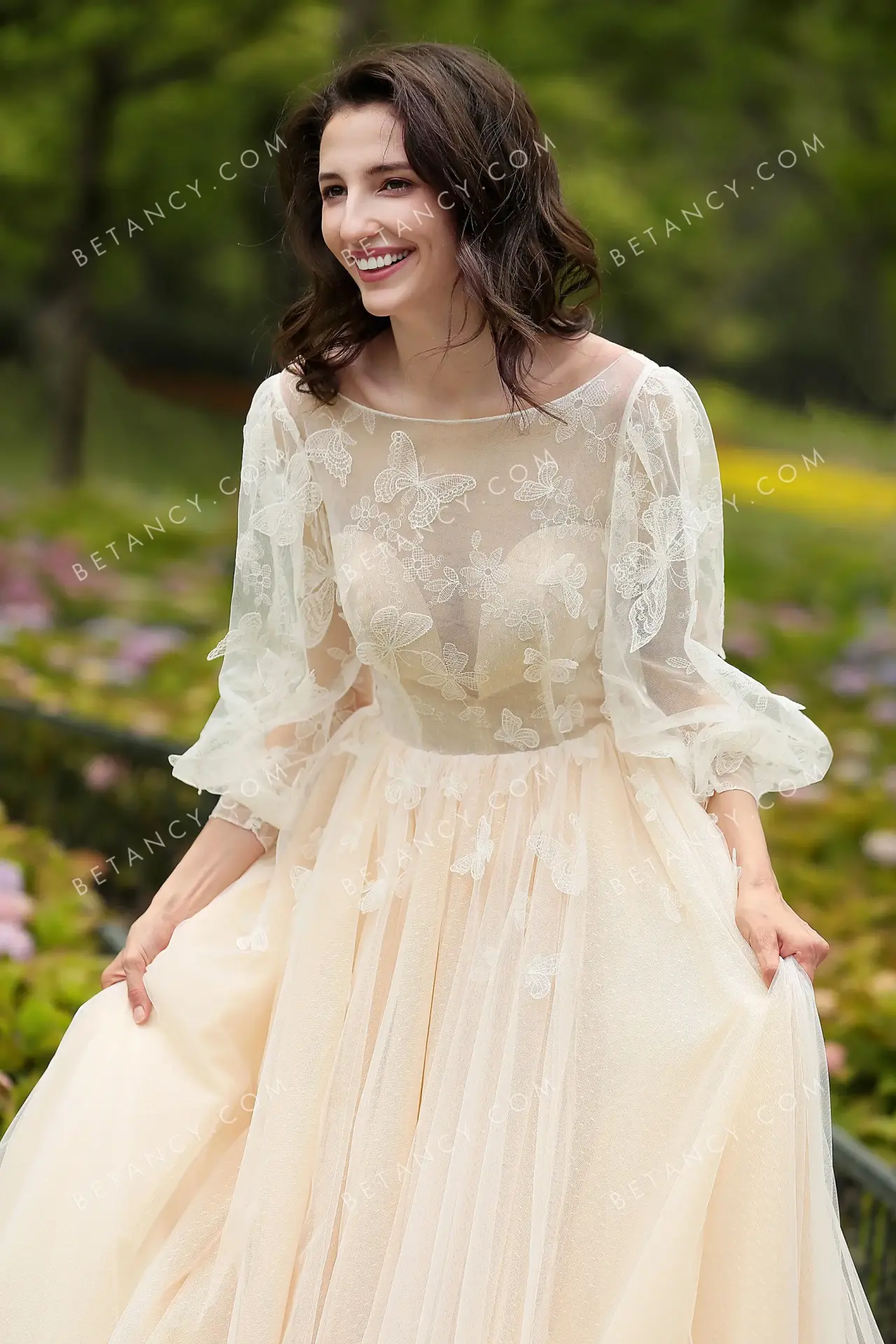 Robe de mariée robe de bal nude – manches évêque illusion & papillons 3D (Betancy)