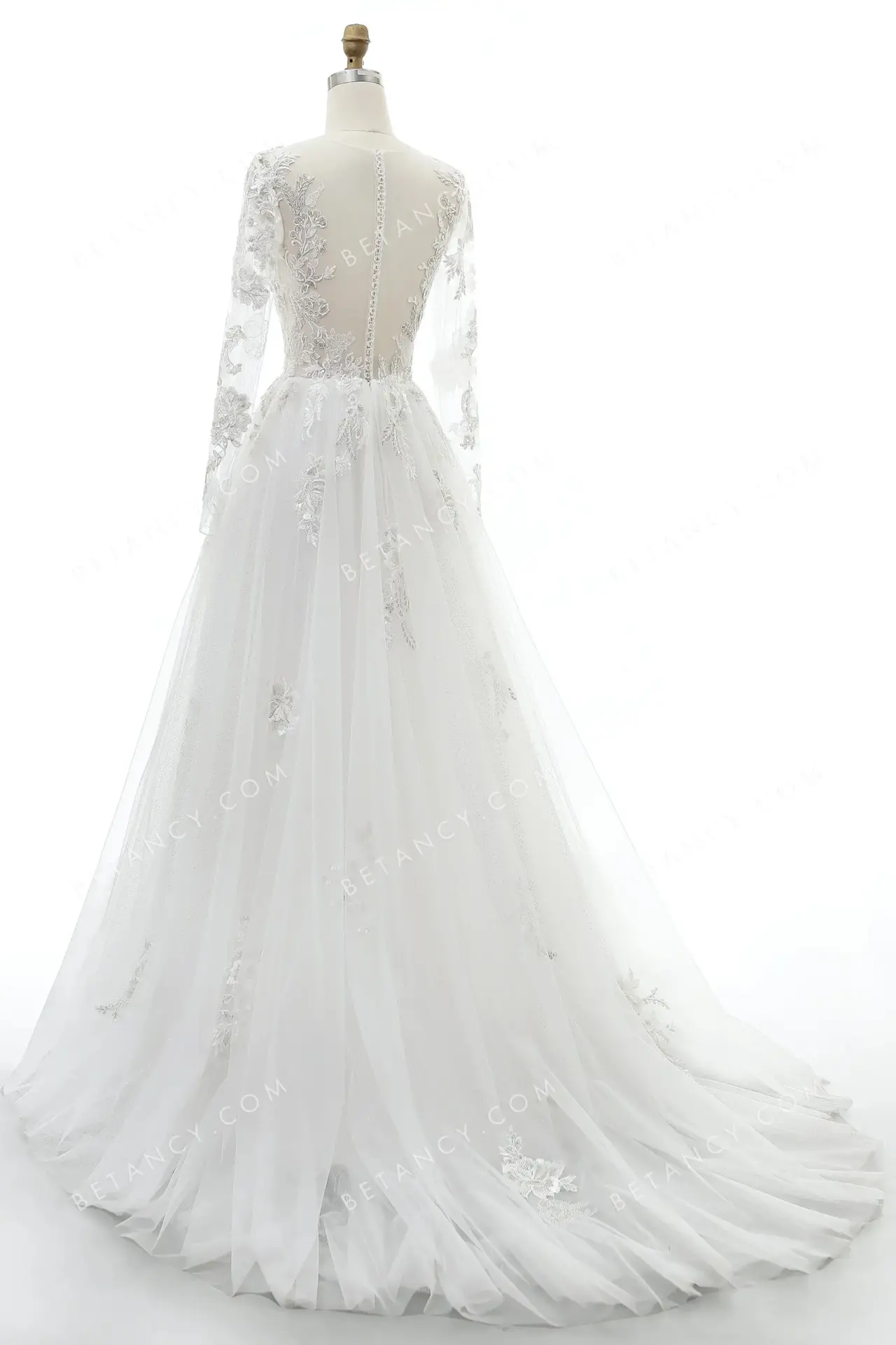 Robe de mariée trapèze en tulle – manches longues illusion & dentelle florale pailletée (Betancy)