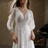 Robe de mariée bohème en dentelle intégrale : décolleté en V plongeant, manches longues et dos bas. Ourlet festonné et traîne en dentelle pour une allure libre, romantique et intemporelle.