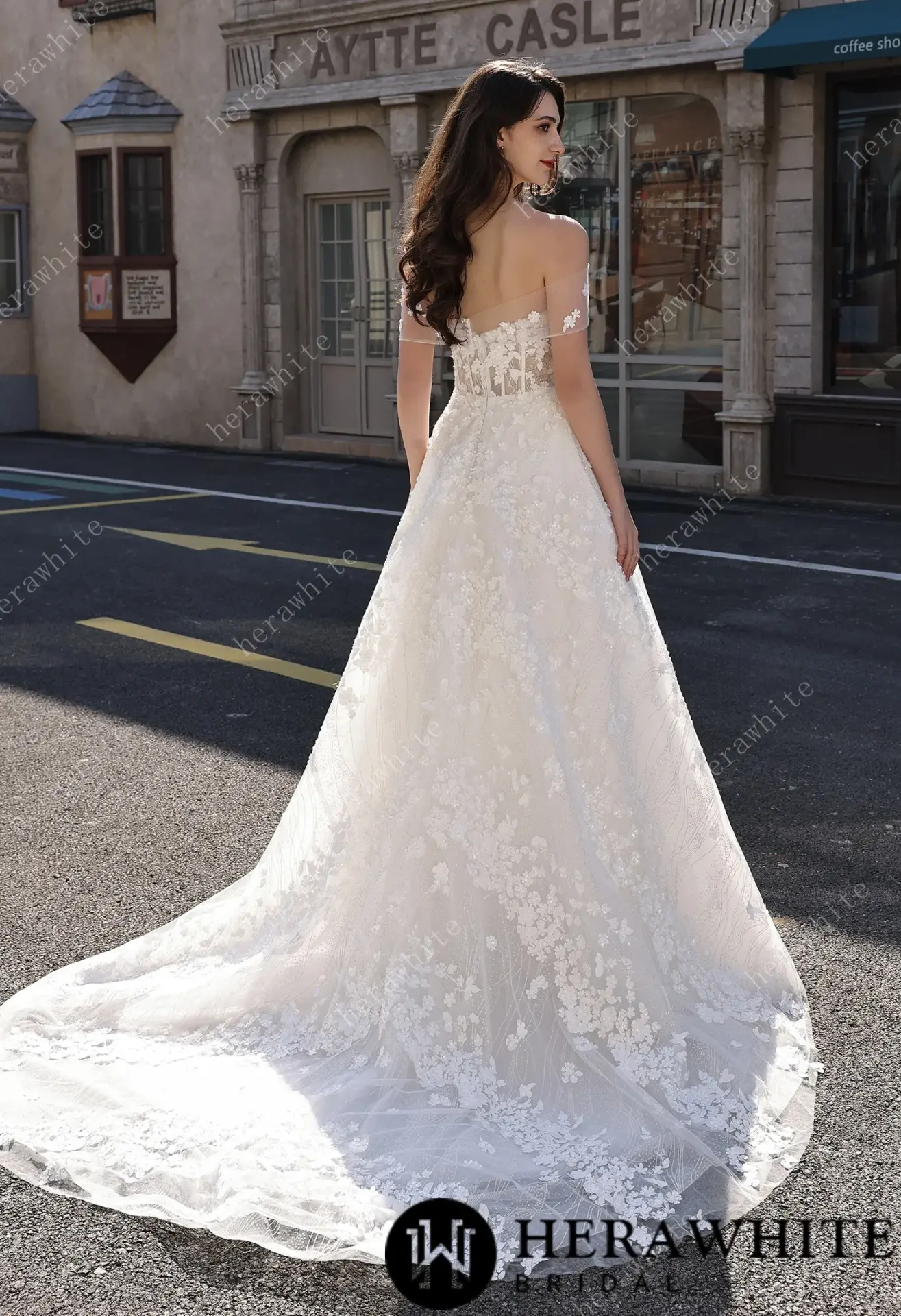 Robe de mariée bustier en dentelle florale 3D avec épaules illusion – vue de dos
