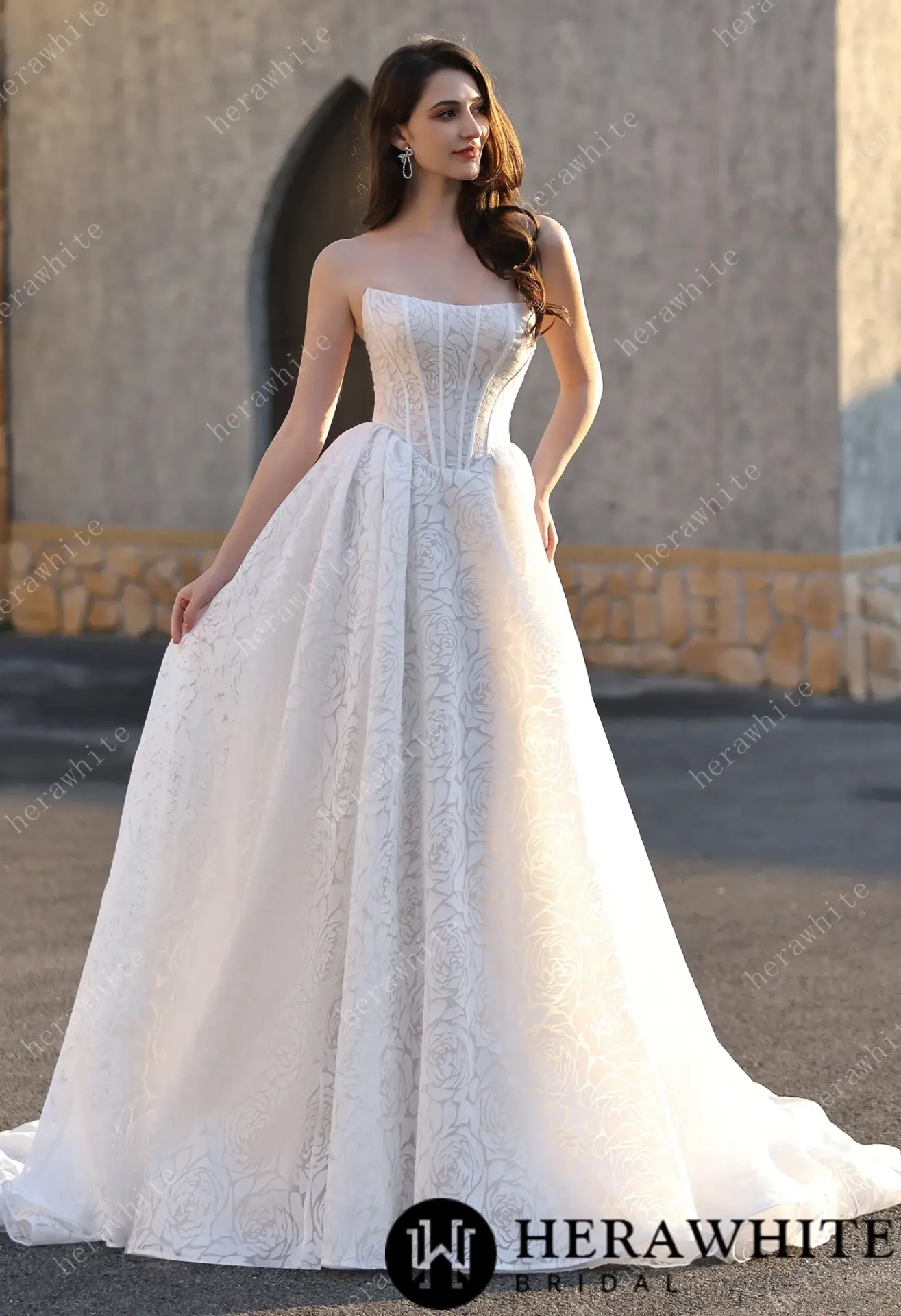 Cette création Herawhite séduit par son design moderne et délicat, mêlant structure et légèreté. Réalisée en jacquard texturé à motif de roses embossées, cette robe offre un rendu visuel raffiné et poétique, parfait pour une mariée à la recherche d’originalité et d’élégance.