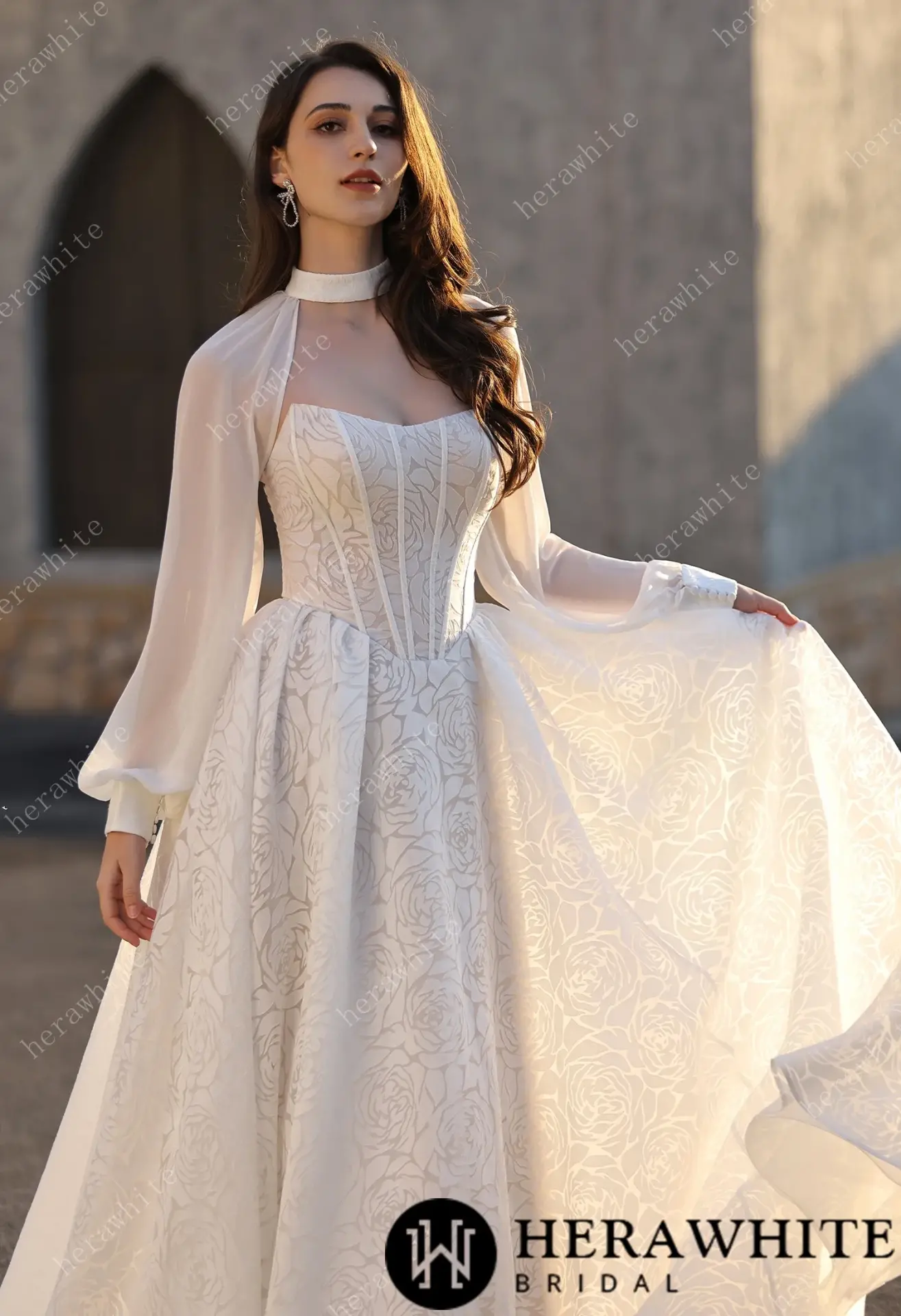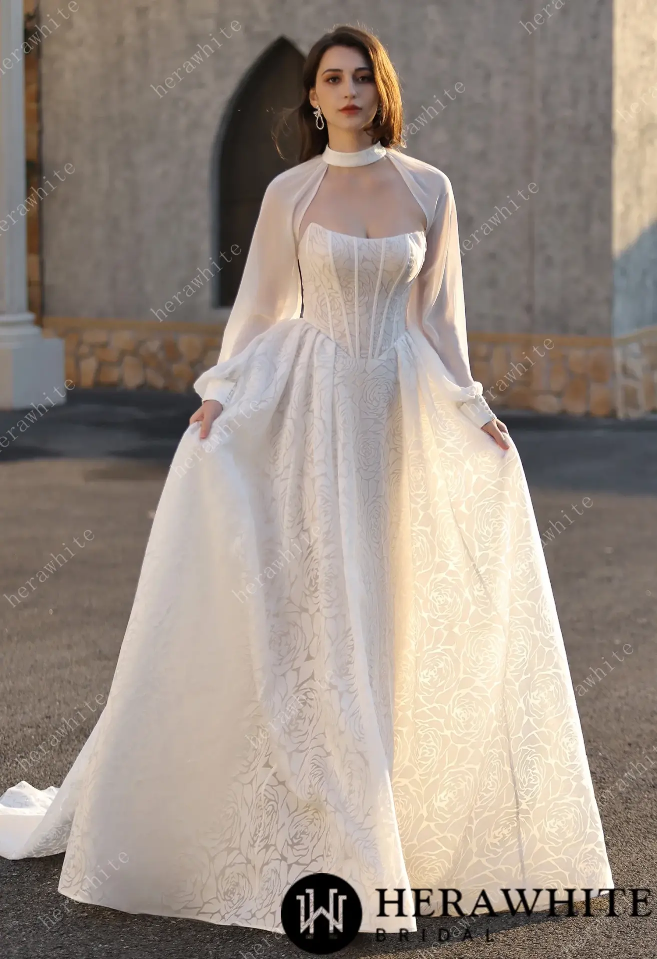 Robe de Mariée Herawhite en Jacquard Rose Texturé avec Col Montant & Cape Détachable Nouveau
