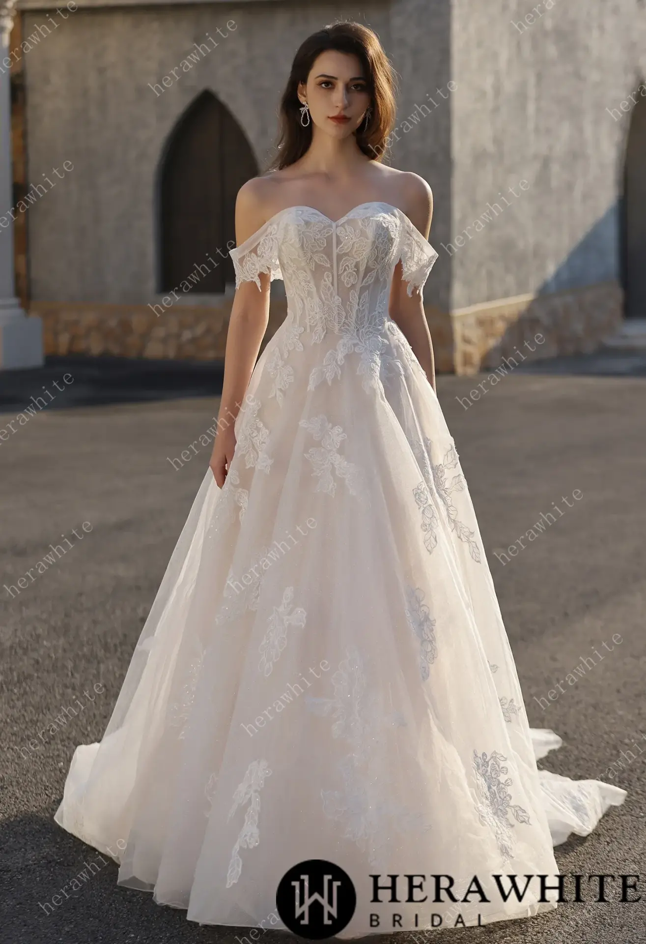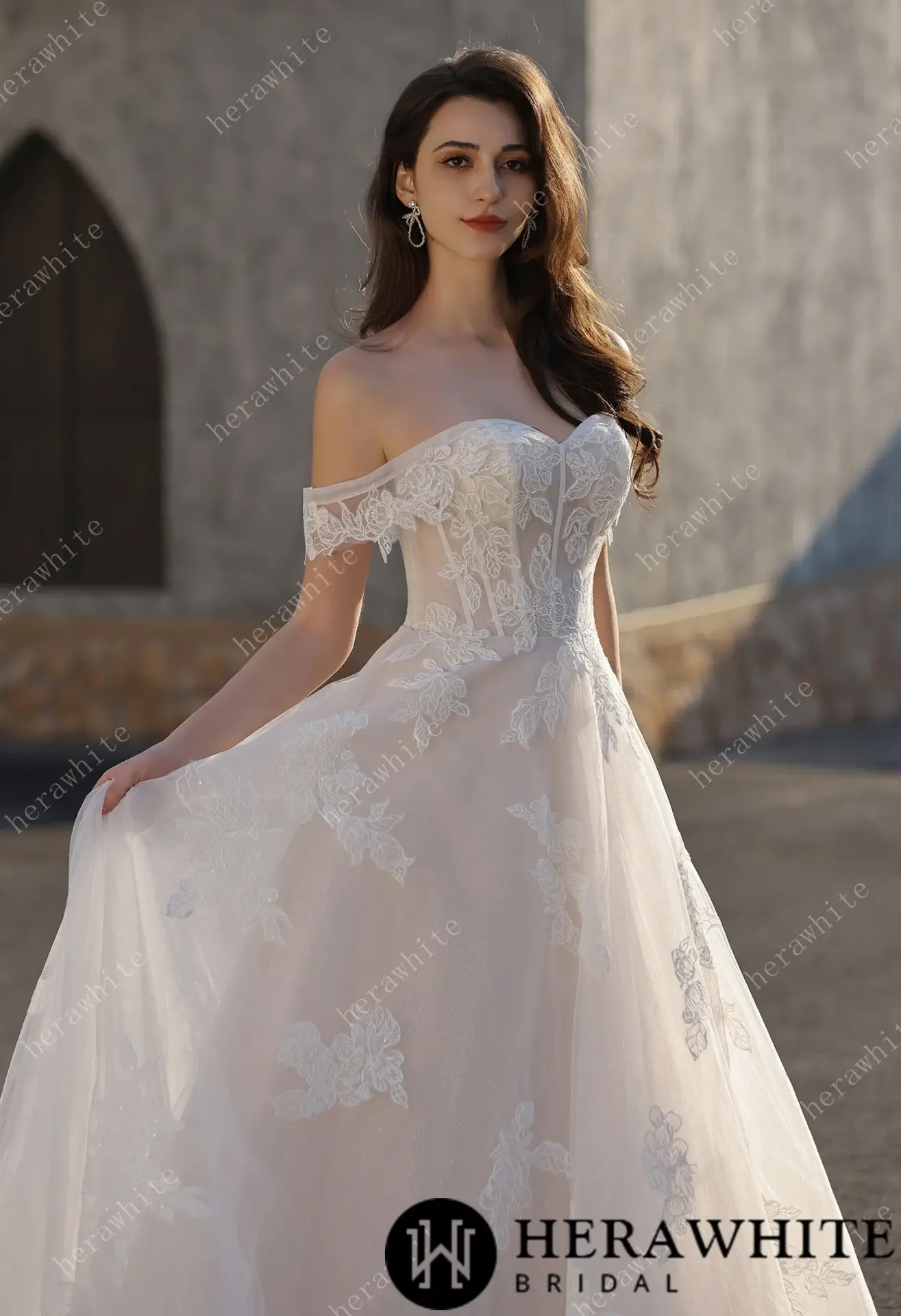 Robe de mariée épaules dénudées avec corsage en dentelle florale appliquée à la main et jupe fluide en tulle léger, pour une allure romantique et élégante.
