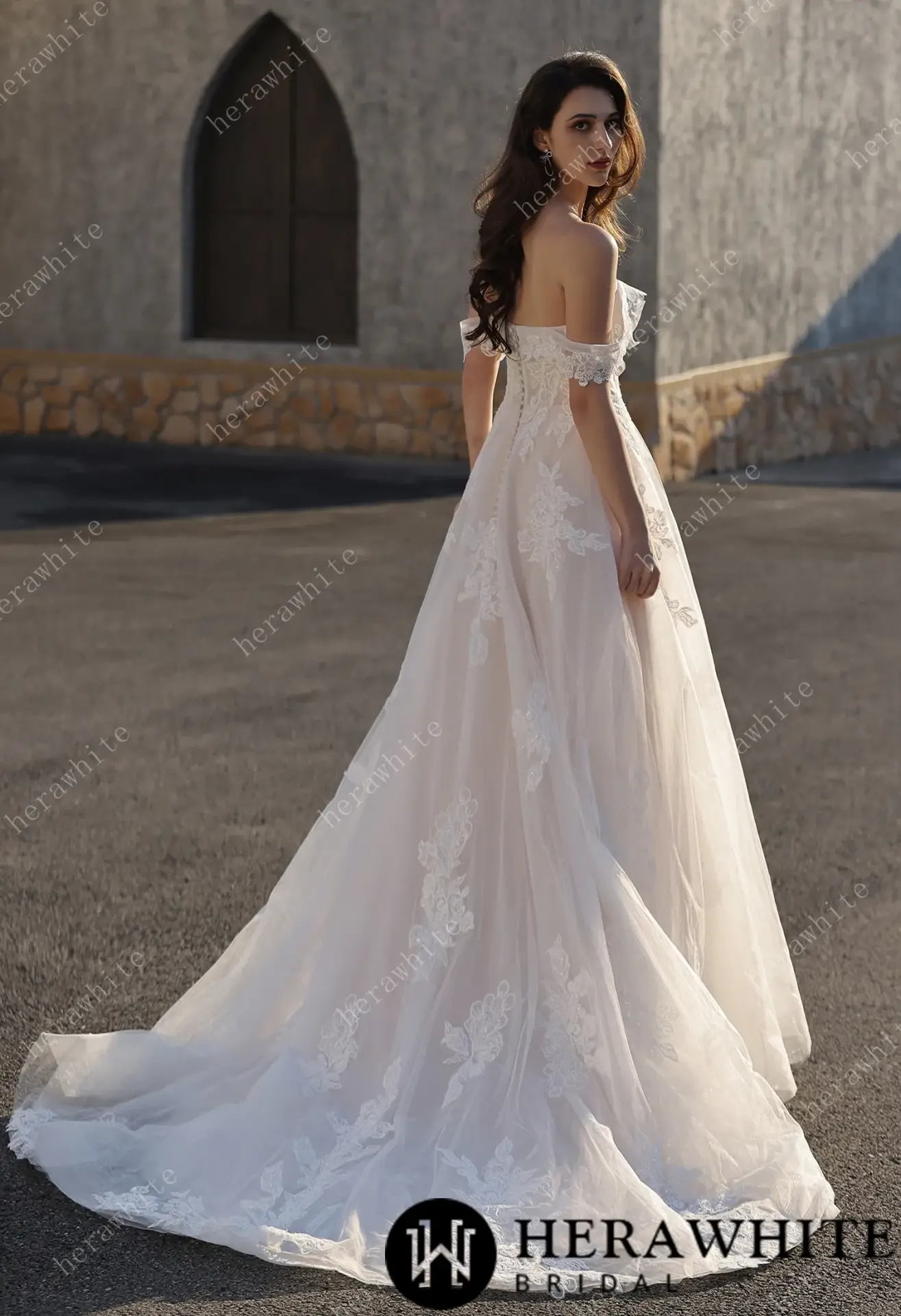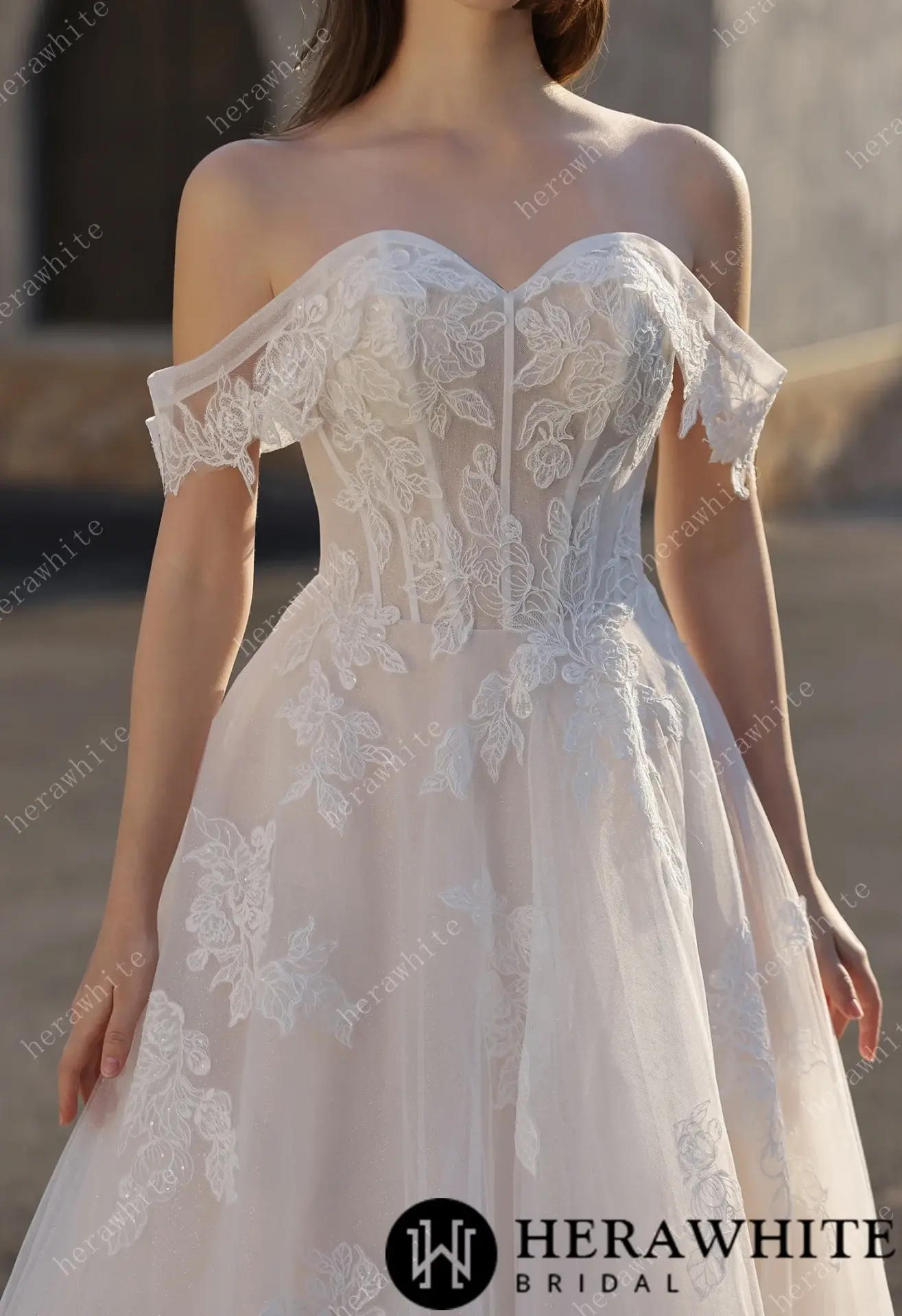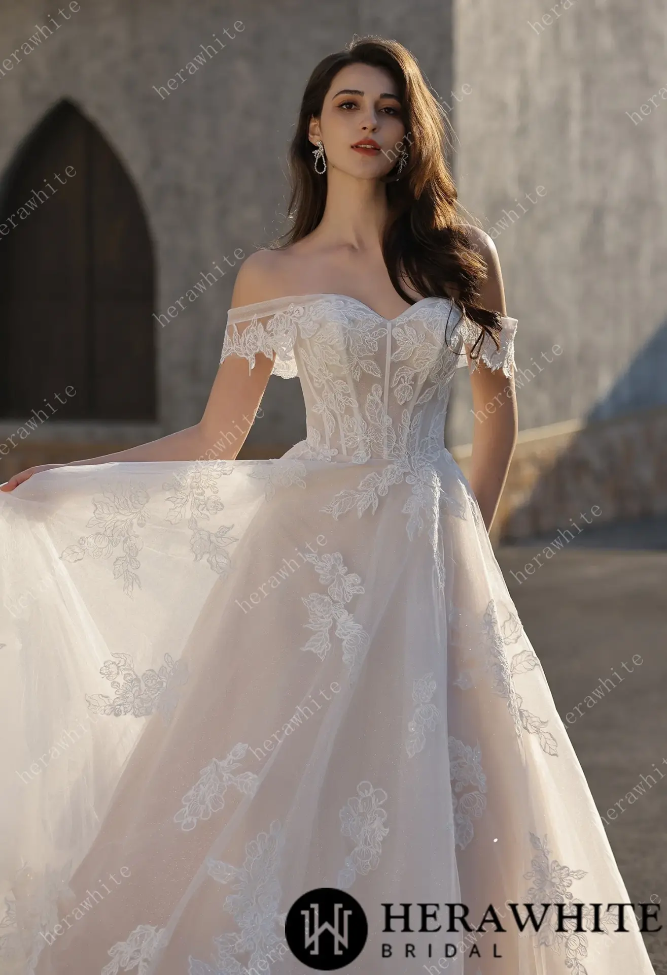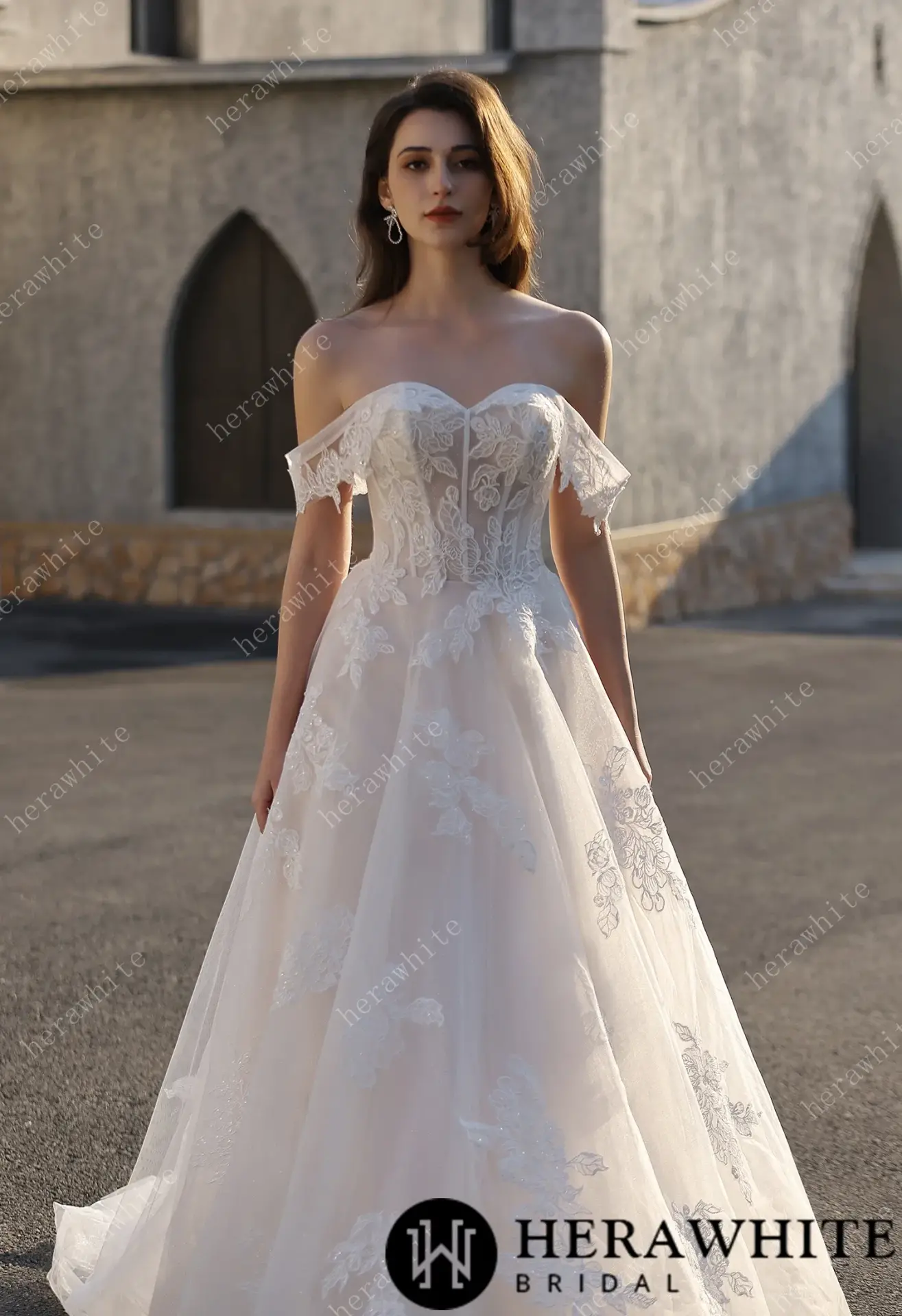 Robe de Mariée Herawhite Épaules Dénudées en Tulle et Dentelle Florale