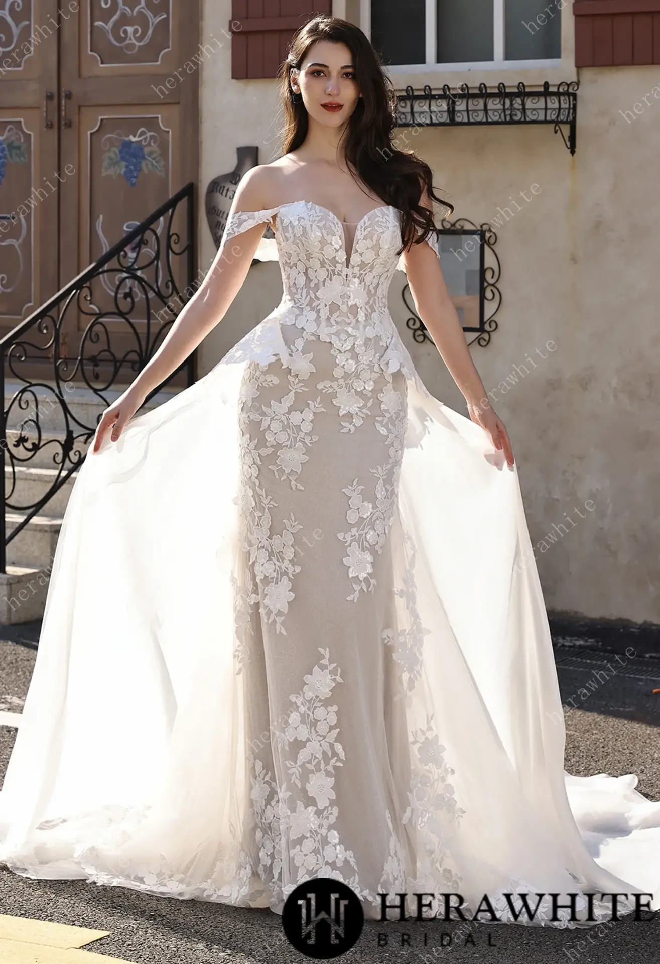 Une robe sirène ultra raffinée signée Herawhite, avec col intégré et jupe superposable pour créer deux looks romantiques et élégants. Un modèle qui sublime la silhouette avec grâce.