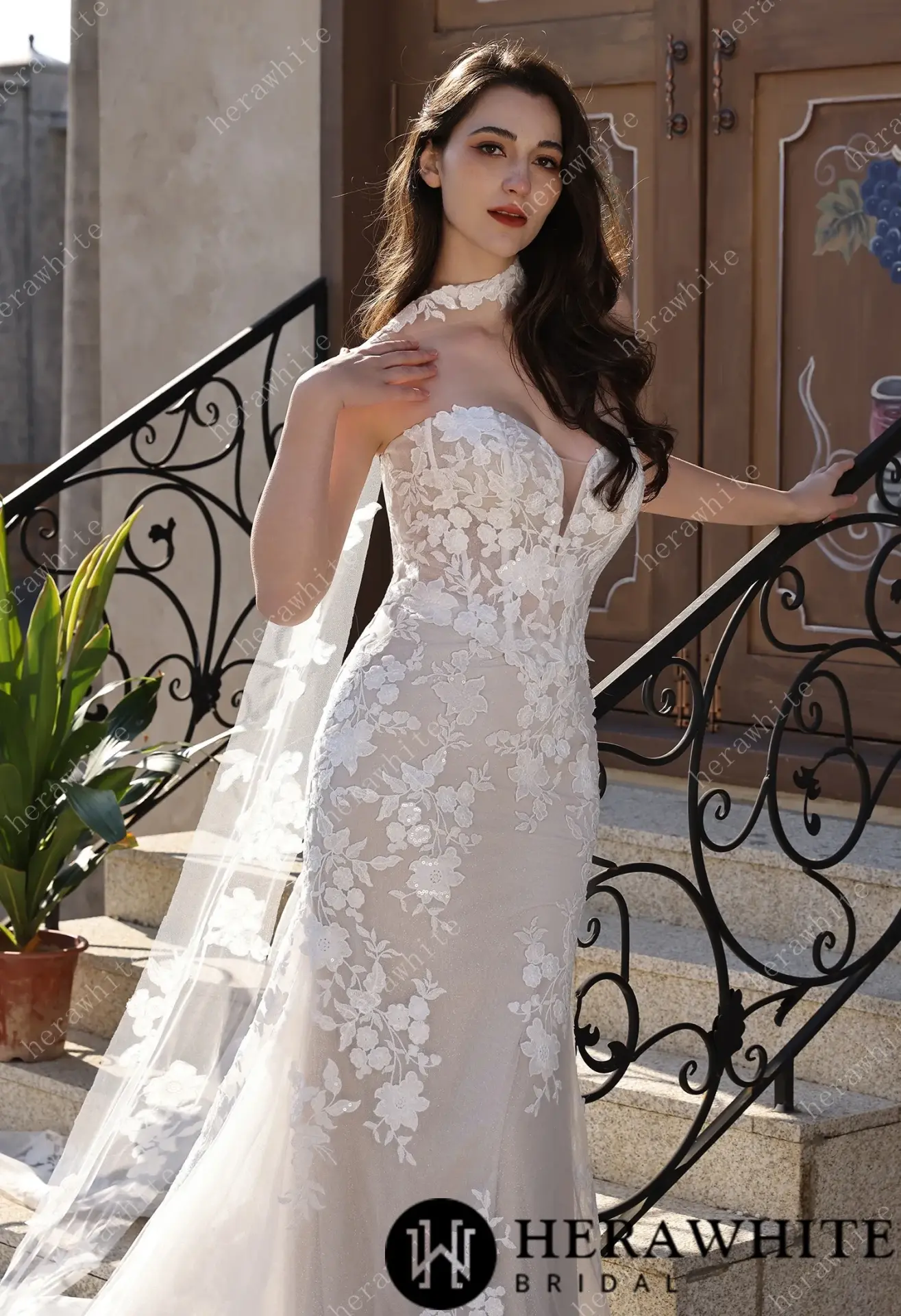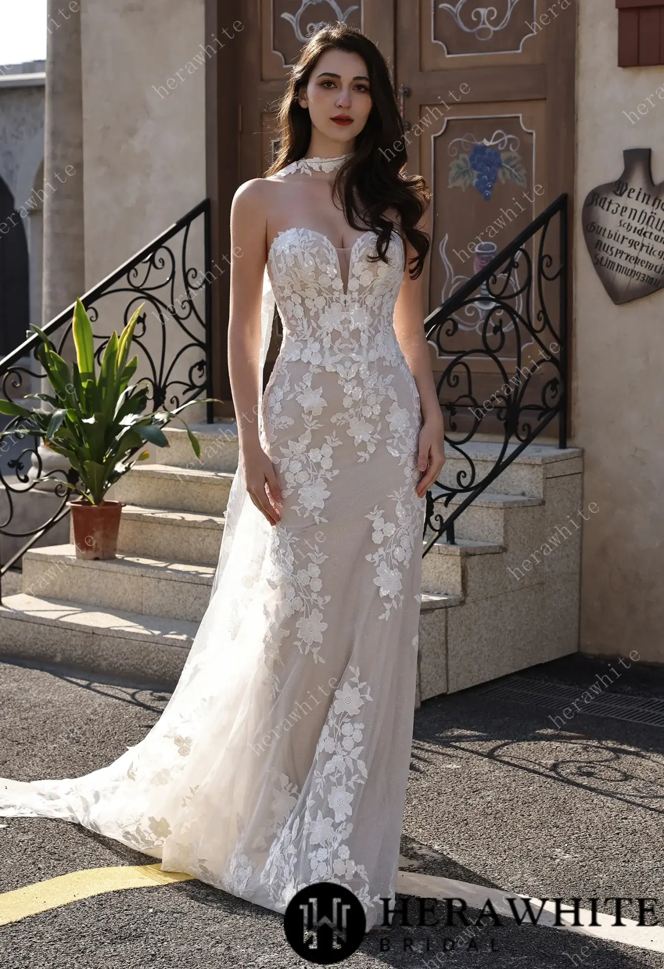 Robe de mariée sirène en dentelle florale à décolleté cœur et ras-de-cou élégant
