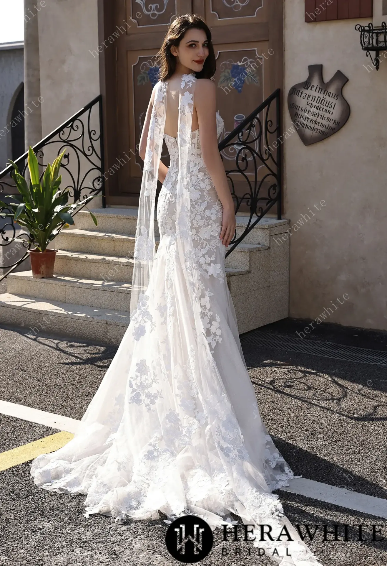 Robe de mariée sirène en dentelle florale raffinée, sublimée par un décolleté cœur plongeant et un ras-de-cou délicat avec voile intégré. Une création sensuelle et résolument chic.