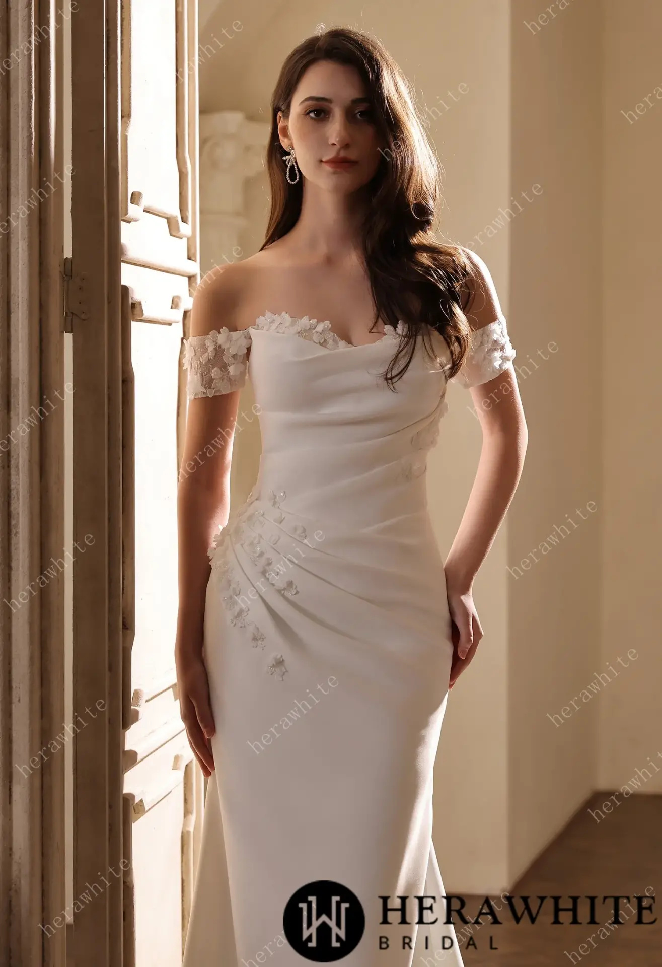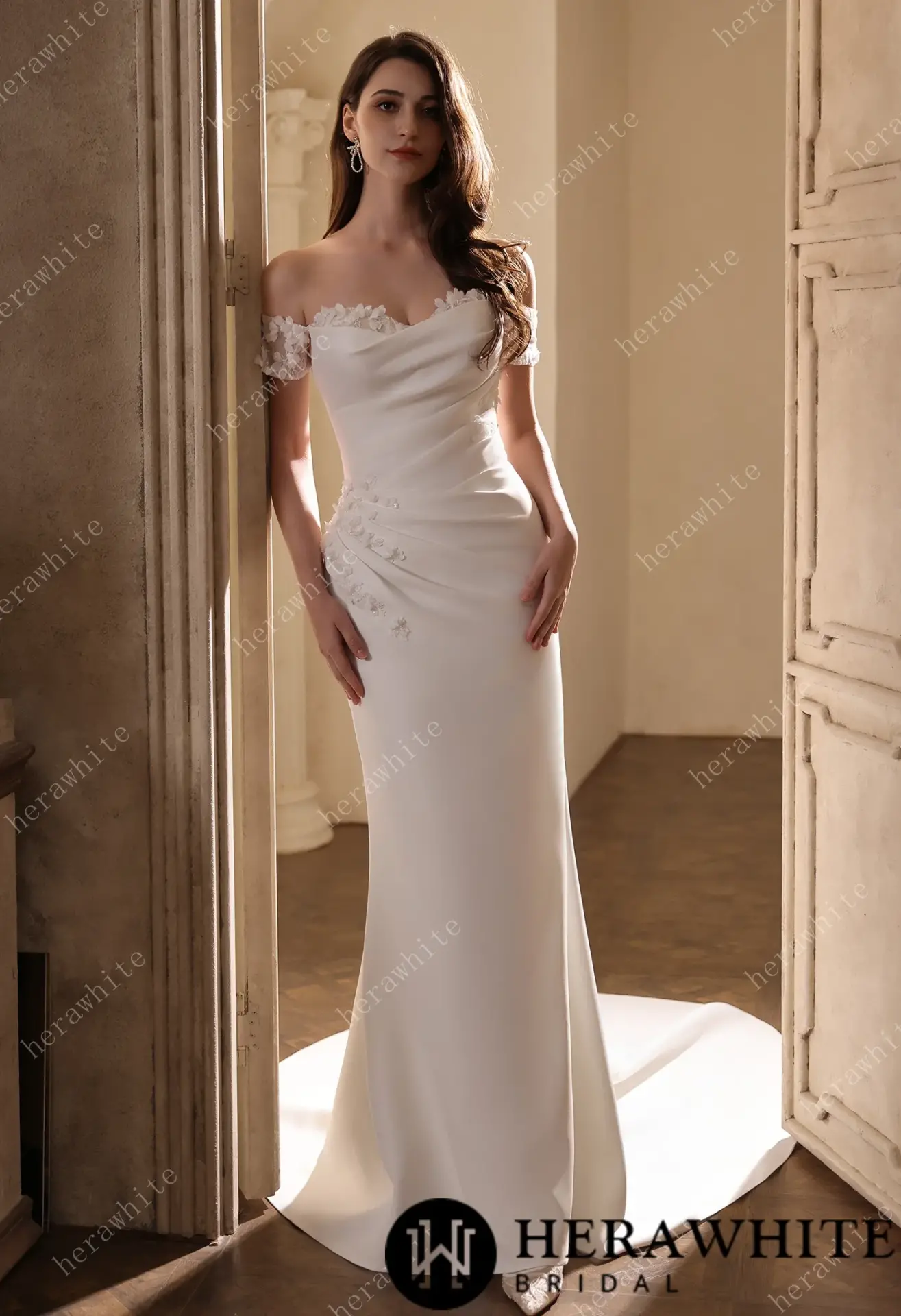 Robe de mariée sirène en satin texturé, sublimée par un décolleté épaules dénudées. Une silhouette élancée et ultra chic, idéale pour un style minimaliste et raffiné.