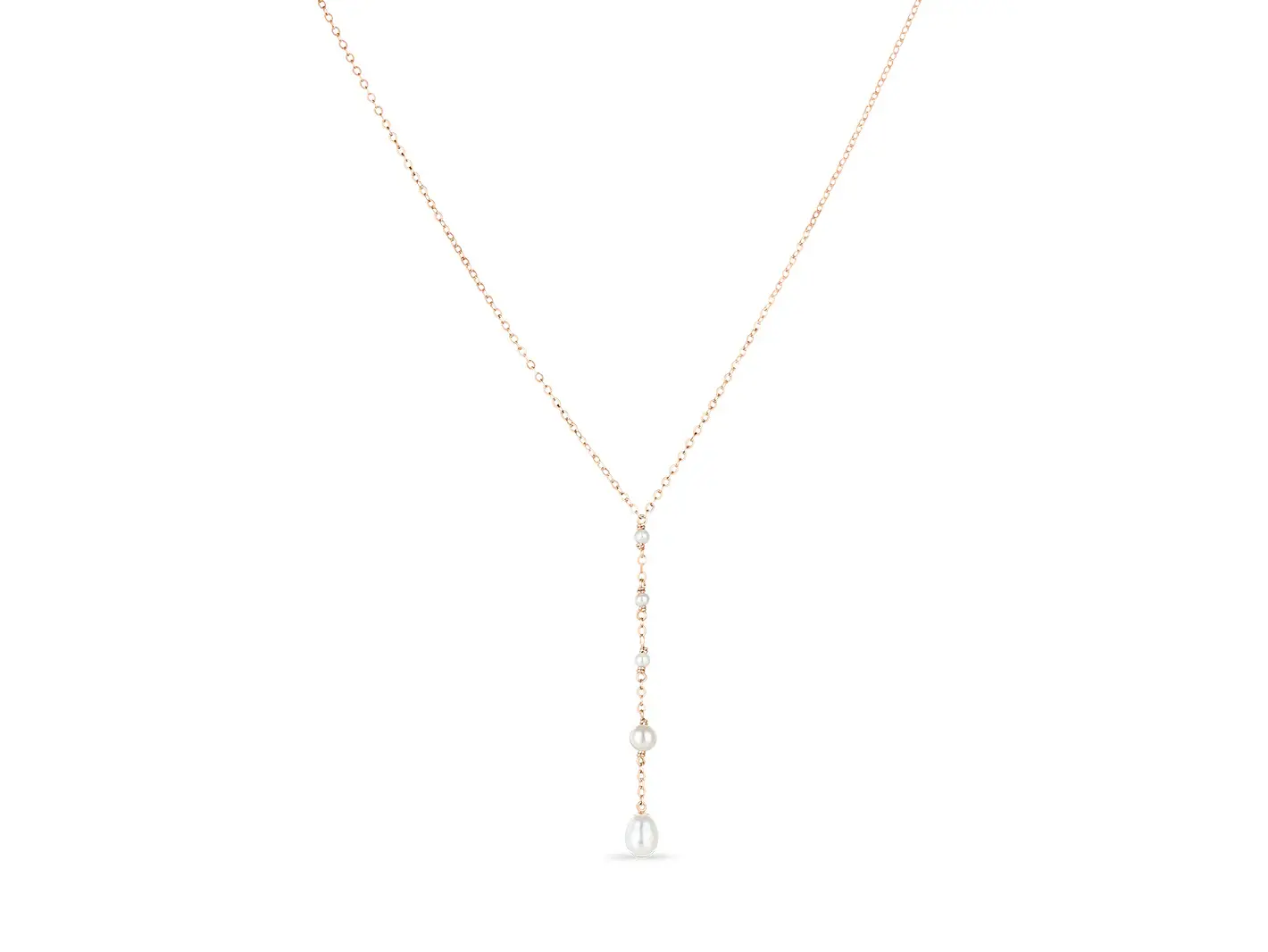 Le collier « Holly » est conçu en forme de Y : une chaîne fine d’environ 46 cm qui se prolonge par une chute délicate ornée de perles d’eau douce graduées (≈ 2 à 8 mm). Cette silhouette allonge visuellement le buste et met en valeur un décolleté en V ou une robe dos nu.